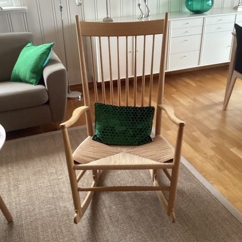 Utført i såpevasket bøk og omtrukket i Hallingdal 130. Stolen er original fra ca 1970-80, og fremstår som meget pen. Totalrenovert tilstand