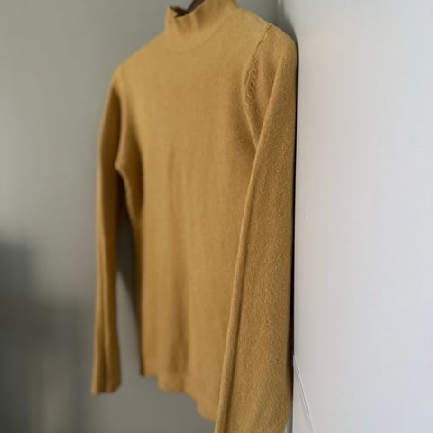 Pent brukt sennepsgul genser i viskose fra merket America Today. Skikkelig fin med skjørt, høytlivede bukser og under vester. Noen nupper.