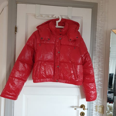 Vinterjakke i størrelse XL . Kort modell.Jakken er laget av polyester og har en rød farge. Den har en glanset overflate og er utstyrt med hette med pelskant. Jakken har lommer og er designet for bruk i kaldt vær.