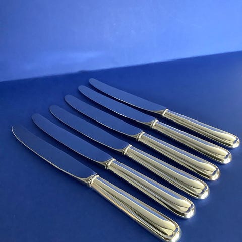 12 stk. kniver I sølvplett. Må pusses. Vanlig bruksslitasje. 21cm lange. Selges samlet