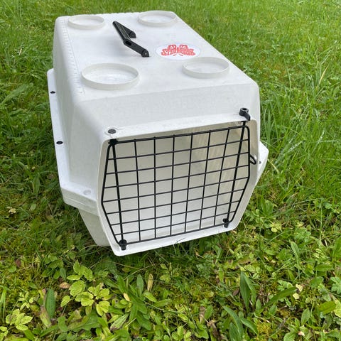Modkat kattedo med lokk og uttrekkbar skuff for enkel rengjøring. Designet for å gi en lukket og hygienisk løsning for katter. Farge: lyseblå med hvit skuff.