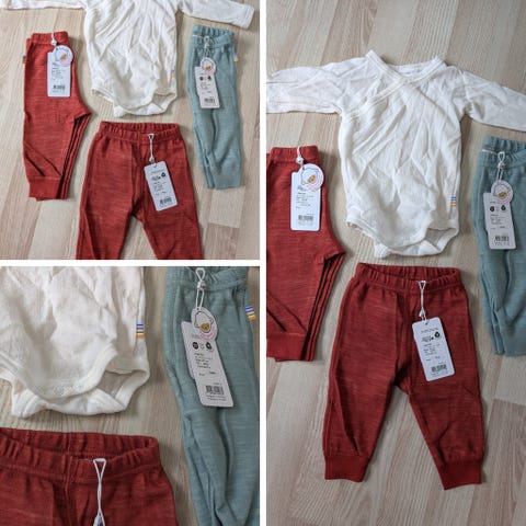 Joha barneklær i størrelse 56-74 for unisex barn. Settet inneholder flere plagg i ulike farger og materialer, egnet for små barn.