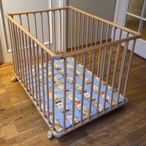 Lekegrind har mål på 100 x 100 cm og en høyde på 72,5 cm. Lekegrind har hjul som gjør det lett å trille rundt, og de har også bremser.