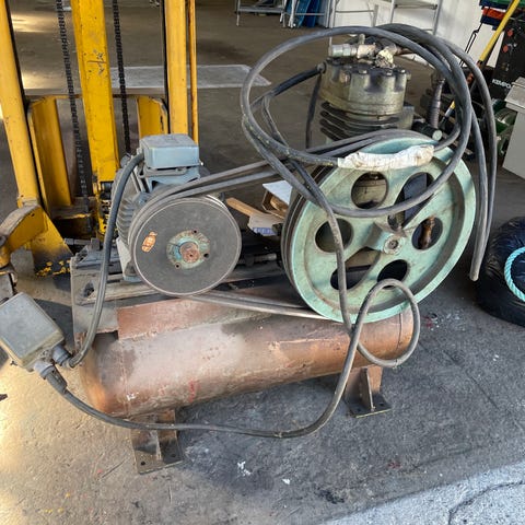 Maskin & Lundt & Co kompressor med 300 liters luftbeholder og arbeidstrykk på 8 bar. Kompressoren har elektrisk motor og er egnet for lufttrykkrelaterte oppgaver