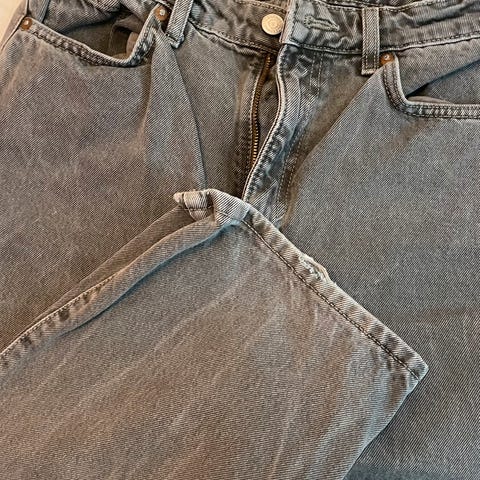 Kule & pene gråsvarte / svarte Monki Denim jeans i størrelse XS for kvinner, med midjevidde W27. Jeansene er grå og laget av denim materiale. Vide ben. 40 grader maskinvask