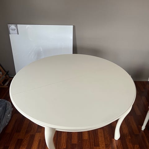 Meget Pen solid over 100 år gml bord med 3 innleggsplater og 8 stoler vurderes solgt da jeg har fått tak i et annen mindre bord.stol er inkl prisen. Prisen er satt - utvidelse x3 plater hver plate 50 cm du kan altså få et bord som er rundt 118 til å bli 2m 68 cm .. bord til 12-14 gjester.. fine utskjæringer på bordet og beina.prisen er satt .selger med vedmod . Det er inkludert 8 pene stoler. Settet er svært solid stabil og pen til å være antikk fra 1930 tallet