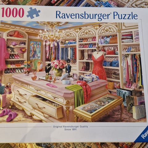 Ravensburger The Coveted Closet puslespill med 1000 brikker. Puslespillet har et detaljert motiv av et klesskap med klær og tilbehør.