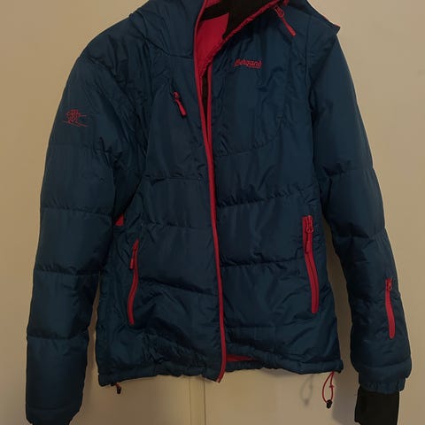 Bergans Annet yttertøy dunjakke i blå farge, størrelse M for dame. Jakken er laget med dun som isolasjonsmateriale og har detaljer som mansjetter med hull for tommel. Egnet for utendørs bruk i kaldt vær.