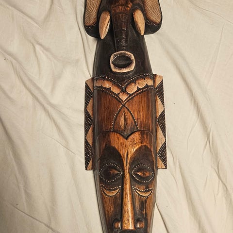 Tre maske i svart farge med utskjæringer for øyne, nese og munn. Masken har et rustikt og naturlig utseende, egnet for å henge på vegg. Den er ca 40 cm høy og ca 22 cm på det bredeste. Dybde (på det bredeste) ca 10 cm.