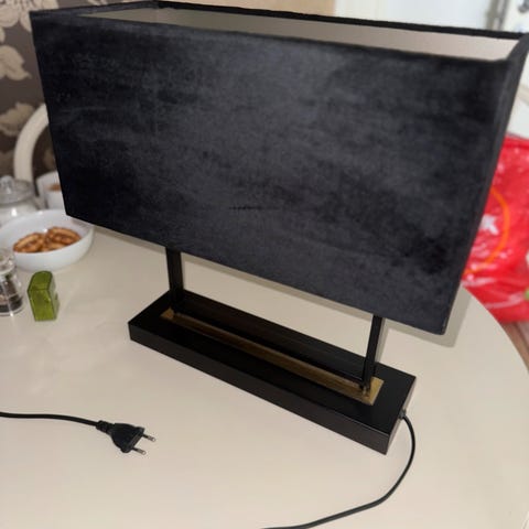 Bordlampe med hvit lampeskjerm. Egnet for bruk på skrivebord eller nattbord.