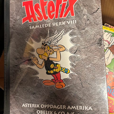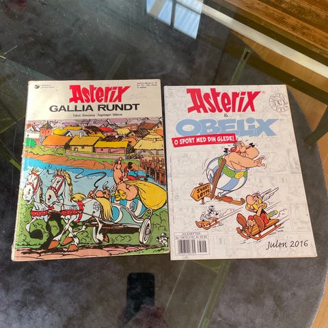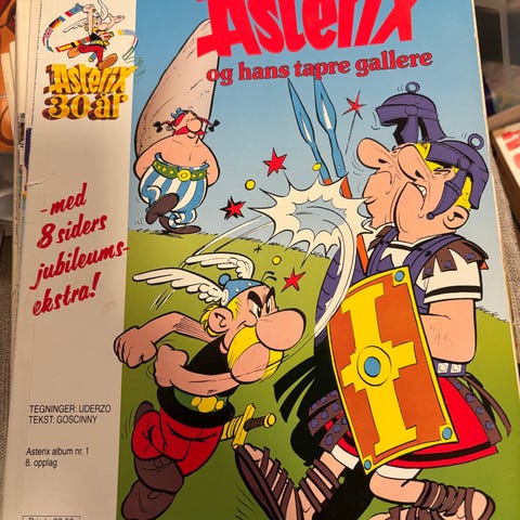 Asterix tegneserier med titlene 'Tvekampen', 'Olympisk Mester!', 'Som Gladiator!', 'Gallia Rundt' og 'På Skattejakt'. Serien er på norsk og inneholder ulike historier med karakterene Asterix og Obelix. Kr 20 pr stk