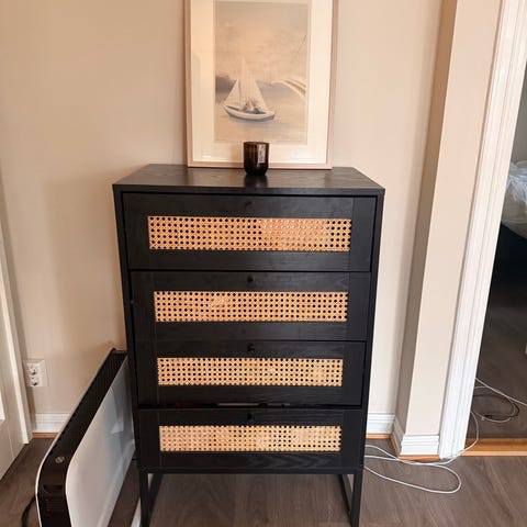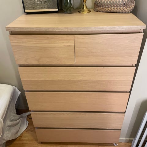Praktisk kommode i eik med 6 skuffer og speil over hylle/skuff med filtbunn selges. Ny koster kr 1495,- og finnes nå kun i hvitt.