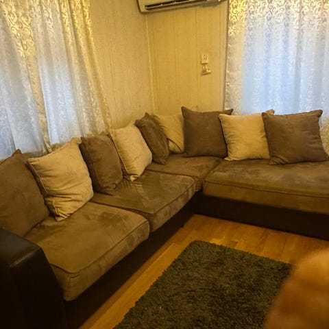 Godt/pent brukt sofa. 67cm/150cm i dybden, 240cm i bredden og 59cm opp til armlenet og 70cm opp til ryggputa(fra bakken og opp til høyeste punkt på puta). Skjøten må skrues sammen undrer ved montering/skjøte de to delene sammen.