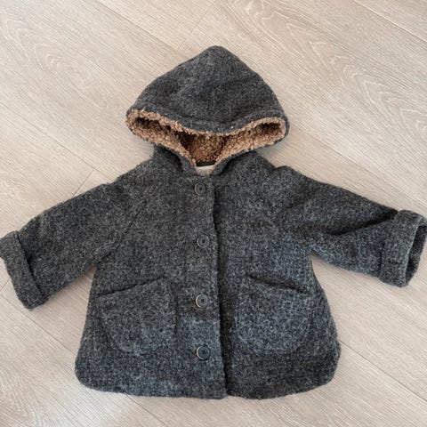 Zara fuskepels kåpe i beige, størrelse 80. Jakken har en myk og varm tekstur med knappelukking foran og rutete fôr på innsiden.