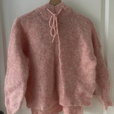 Ganni genser i størrelse M, laget av mohairull. Genseren har en grønn farge og et strukturert strikkemønster. Den er designet for kvinner og egner seg til bruk som et varmt og mykt plagg.