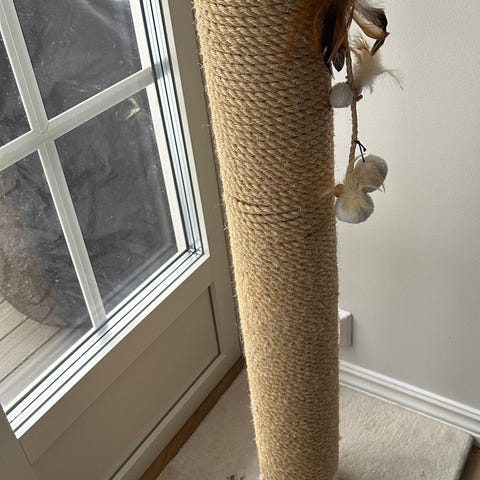 Katt klatre og klørestativ laget av tre, hvitlasert eik, med flere nivåer og plattformer. Inkluderer en hule med runde åpninger og flere klorestolper. Designet for katter som trenger klatremuligheter og hvileplasser. Katten vår har elsket utsikten fra toppen og brukt det med omsorg så det er like fint som nytt.