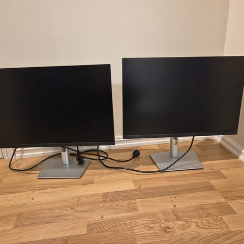 To dataskjermer med 24 tommers skjermstørrelse, inkludert tastatur og mus. Passer til kontor- eller hjemmebruk.
