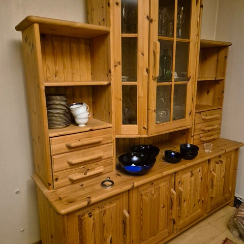 Skap i tre med hyller og dør. Spisebord i tre med rundet form og 2 plater . Vitrineskap i tre med glassdører og flere hyller. Møblene er egnet for oppbevaring og spising i hjemmet.
