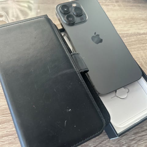 Apple iPhone 15 Pro mobiltelefon med 128 GB lagringskapasitet i svart farge. Brukt i 1,5 år.