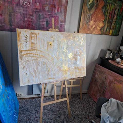 Stort abstrakt maleri, malt av meg lagvis i hvitt og gulltoner, og litt struktur..🎨 Passer perfekt inn i både hvite og fargede hjem...🌟 120×80 cm.