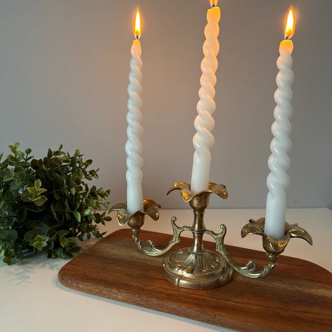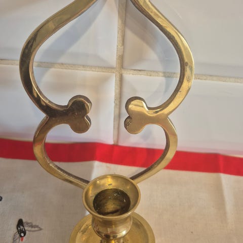 Vintage vegglysestake i messing. Den har en dekorativ design og er laget av messingmateriale. H: 30 cm B: 19 cm. Søkeord: messing,lysestaker, lysestake, interiør,vintage, retro,unik,dekor, dekorasjon, stue, belysning