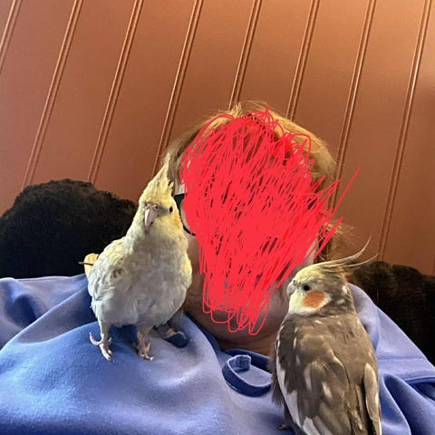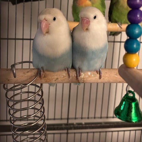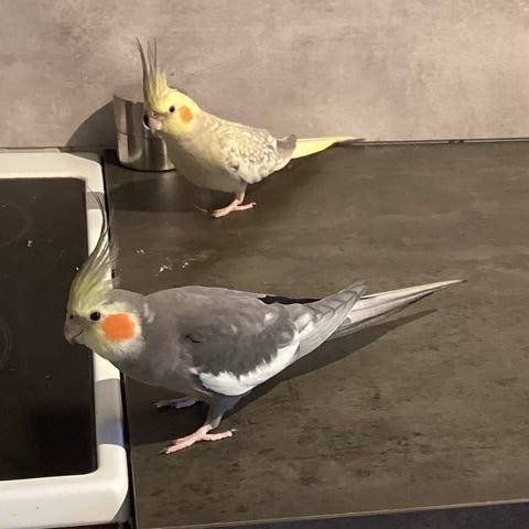 Han er blitt håndoppmatet og håndtert siden han var 2 uker gammel så han er ganske trygg på hender, liker å sitte på skulderen og bli med overalt.