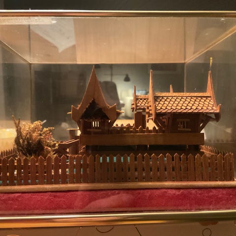 Fremstår som afrikansk-inspirert kunsthåndverk, trolig laget som dekor/eksportarbeid på midten av 1900-tallet. Pent håndverk med synlig trestruktur og fin patina. Står stødig og er i god brukt stand.