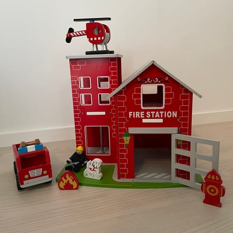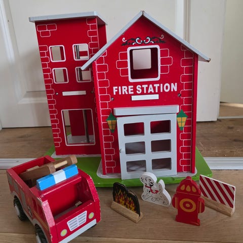 Flott brannstasjon i tre fra Sprell. Medfølger brannbil, helikopter, to brannmenn og tre andre figurer. Pent brukt og i god stand, noen små bruksmerker, men ingenting er defekt. Må hentes på Nordnes i Bergen. Ny pris på nett nå kr 1299,-