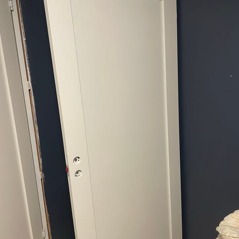 Harmonie slett hvit innerdør med målene 90x210 cm i hvit farge. Døren fulgte med nybygg tatt over i slutten av noveber 25, så er omtrent ny. Braketten til ene hengsel knakk under demontering.