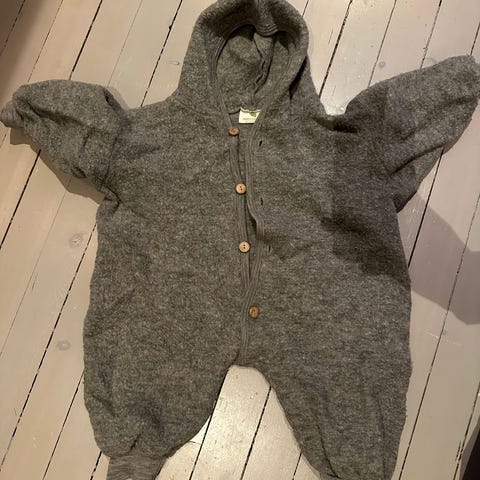 Nøstebarn ull heldress i størrelse 74, grå farge. Laget av 100% ull. Dressen har trykknapper.