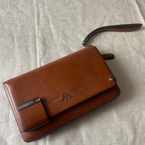 Gul veske i skinn fra Botkier New York. Kan brukes både med og uten skulderstropp. Flere innvendige lommer. Noen synlige merker fra bruk. Dustbag følger med.