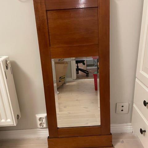Selger et solid og pent veggspeil med ramme i heltre. Speilet har en klassisk utforming med dekorativ bue øverst, og passer fint i gang, soverom, stue eller hytte.