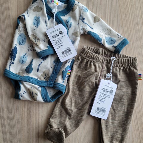 En omslagsbody og to bukser med føtter, alle i myk og god ull og viskoseblanding fra Joha, str 50. Lue i 100% merinoull i str 37 (0-1 mnd), også fra Joha.