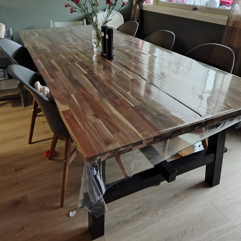 Vårt flotte spisebord i akasietre fra Ikea med 8 stoler (disse også fra Ikea) selges grunnet plassmangel. Bordet har noen hakk i det ene hjørnet takket være min eldste datter. Når det ble oppdaget begynte vi å bruke plastduk over det for å hindre slitasje.