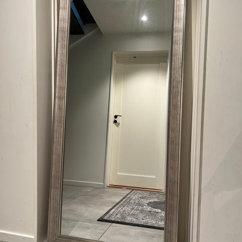 Speilet er 170 cm høyt, står stødig og gir et elegant uttrykk i entre, stue eller soverom.
