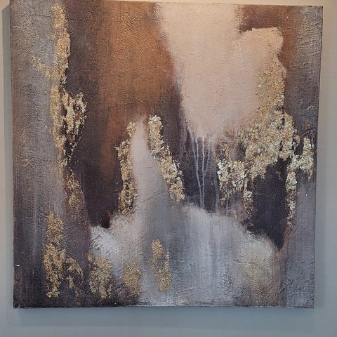Maleri selges rimelig. Usikker på om det er trykt eller faktisk malt, men har tydelige penselstrøk og struktur. London skyline. Har hengt på veggen i gangen (ikke utsatt for sol) i gode 10 år. Eneste slitasje er på baksiden ved hjørnene hvor det nok har skrapt litt mot veggen når det ble hengt opp.