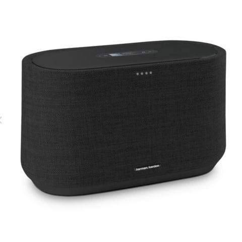 Harman Kardon høyttaler med svart stofftrekk. Produktet er beregnet for lydavspilling og har en moderne design som passer til ulike rom. Ny pris 4450.- stått på et kontor.