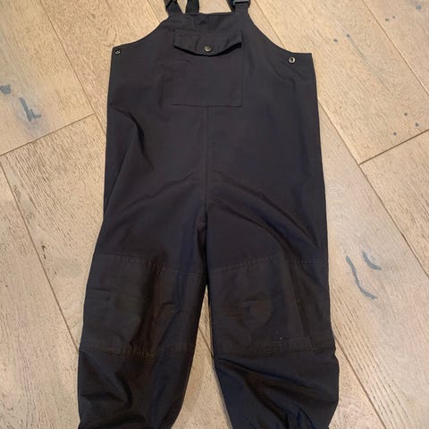 Laget av denim materiale, buksen har justerbare seler og knapper foran. Snekkerbukse.