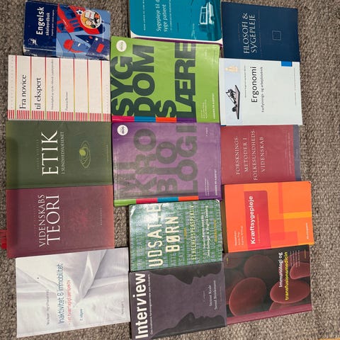 Samling av bøker innen helse og medisin, inkludert emner som smerter, farmakoterapi, psykofarmaka, sykepleie, og helsefaglige temaer.