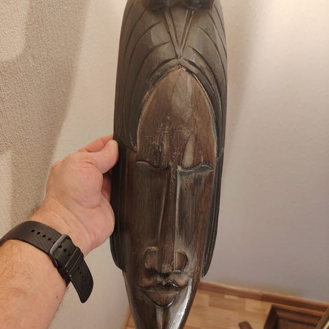 Jeg er ikke fagperson, og informasjonen som gis er basert på generell kunnskap og tilsvarende masker jeg har sett på bruktmarkedet. Masken fremstår som et dekorobjekt, trolig laget for eksport/turistmarked, og ikke som en autentisk ritual- eller stammemaske.