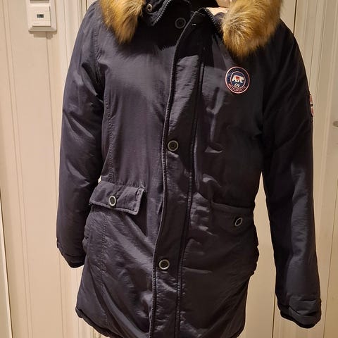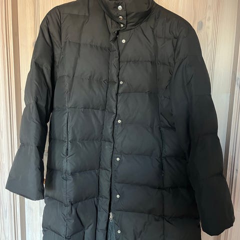Str 44. Veldig lite og pent brukt, da den er for liten til meg. Jakken består av 90 % dun og 10 % fjær. Trekket er 100 % polamid.