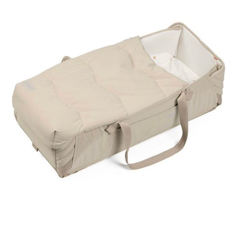 Voksi bærenest i grå farge med polstret madrass. Designet for å bære og transportere spedbarn komfortabelt. Utstyrt med bærehåndtak for enkel håndtering.