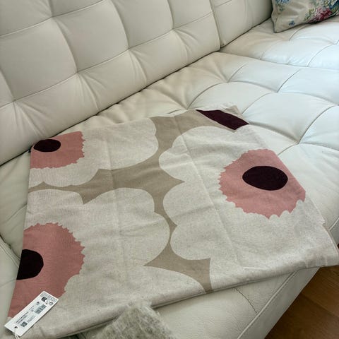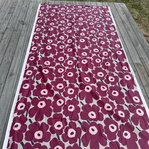 Marimekko Unikko tekstil med rødt og hvitt blomsterprint. Tekstilet har det karakteristiske Unikko-mønsteret med store valmueblomster i røde og rosa nyanser på hvit bakgrunn.