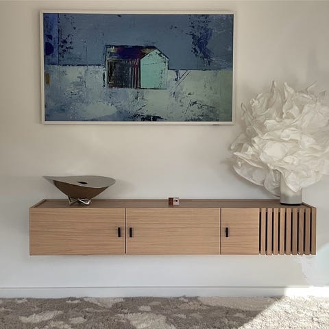 Skapet er i god stand. Dock är det ett par hål för kabler bak samt lite färg under hyllene. Men detta syns inte!