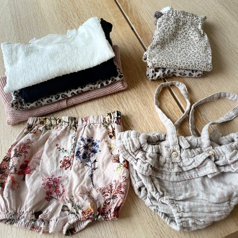 Pent brukte klær. Ullpysj fra reflex. Pysj og bukse med rysjer fra Lindex. Body med volang fra memini. Prikket body fra Claire og rosa ribb-bukse fra hm. Anmerkning på ullpysj- se bilde.