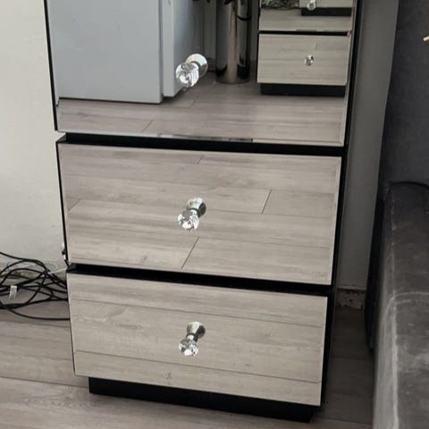 I fin stand, men liten sprekk på siden og på platen som vist på bilder. God plass til oppbevaring.