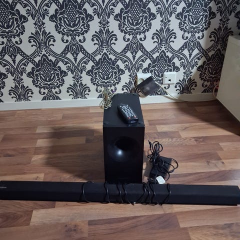 Pent brukt Samsung lydplanke med tilhørende subwoofer. Systemet er designet for å forbedre lydopplevelsen ved tilkobling til TV eller andre lydkilder.