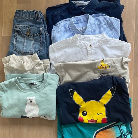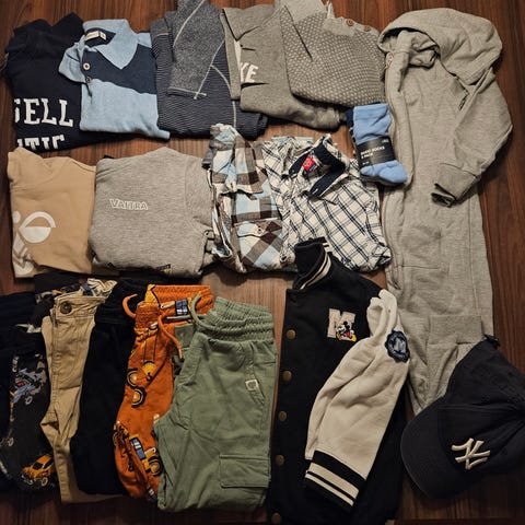 2 gensere, 1 joggebukse, 1 jumper, ermeløs genser, sett t skjorte og shorts, 2 t skjorter, kortermet skjorte, singlet, fleecejakke, og ett tynt regnsett.
