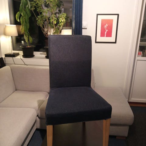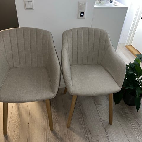 Den ene stolen er litt falmet bakerst på setet (under stolryggen) Den har også en liten sprekk i treverket (se vedlagte bilder).