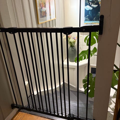 Dette er en BabyDan Flex XXL sikkerhetsgrind, ideell for å sikre områder som rundt peiser eller som romdeler.